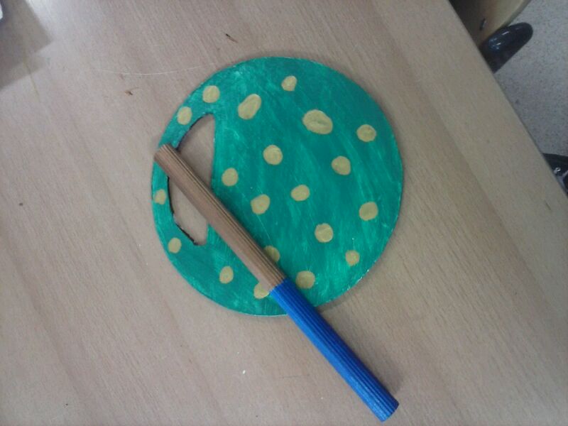 Een voorbeeld van een gemaakt instrument: het is een simpel slag instrument dat de kinderen goed kunnen vasthouden.